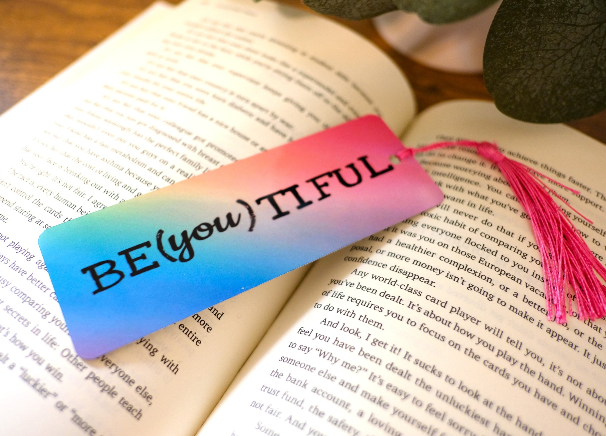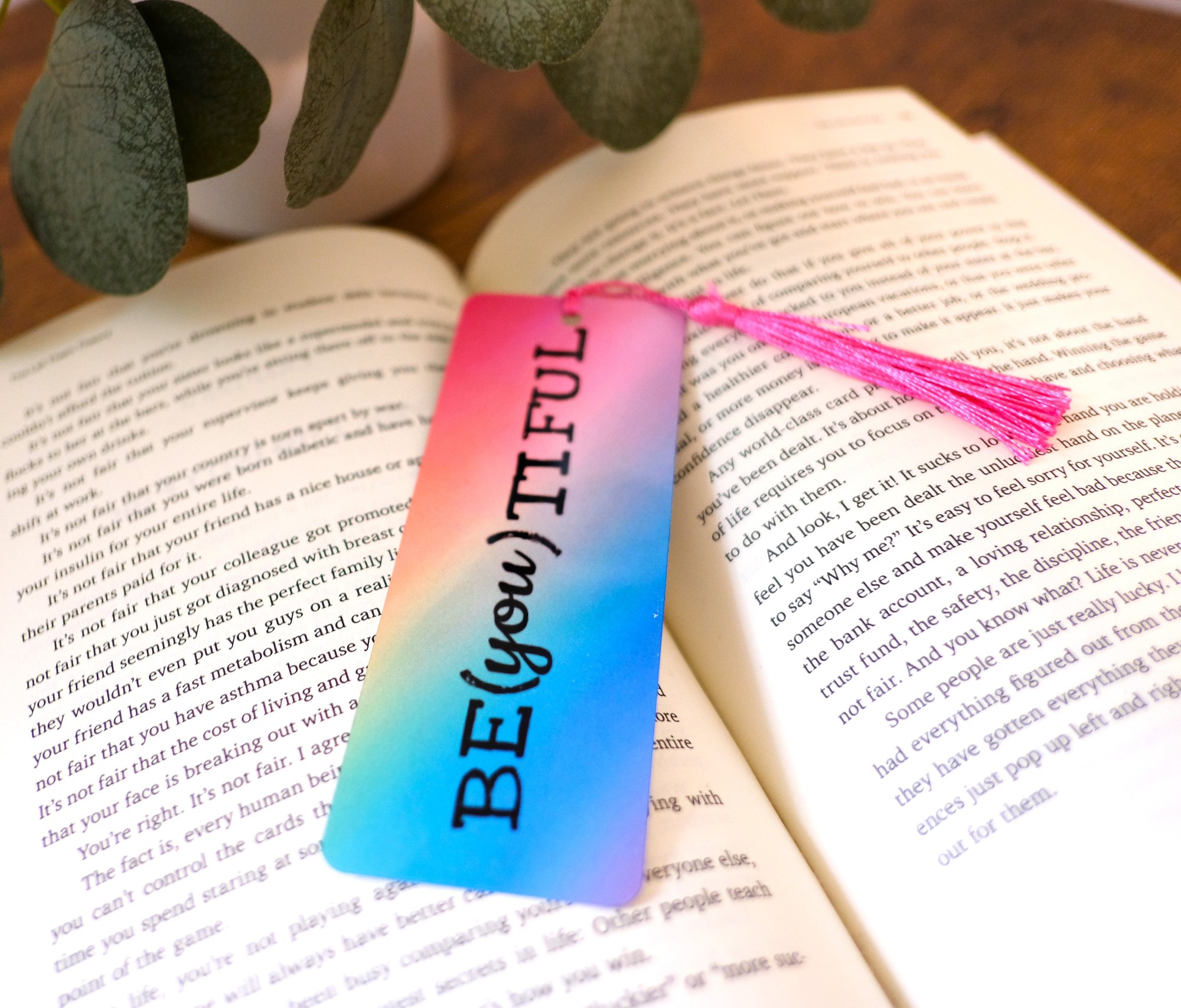 BE (YOU) TIFUL handmade metal bookmark with pink tassel. Background is multi colored and the graphics are black. The size is 2" x 5 1/2". The design is on one side. The handmade design is applied using the sublimation process which means it will not fade.