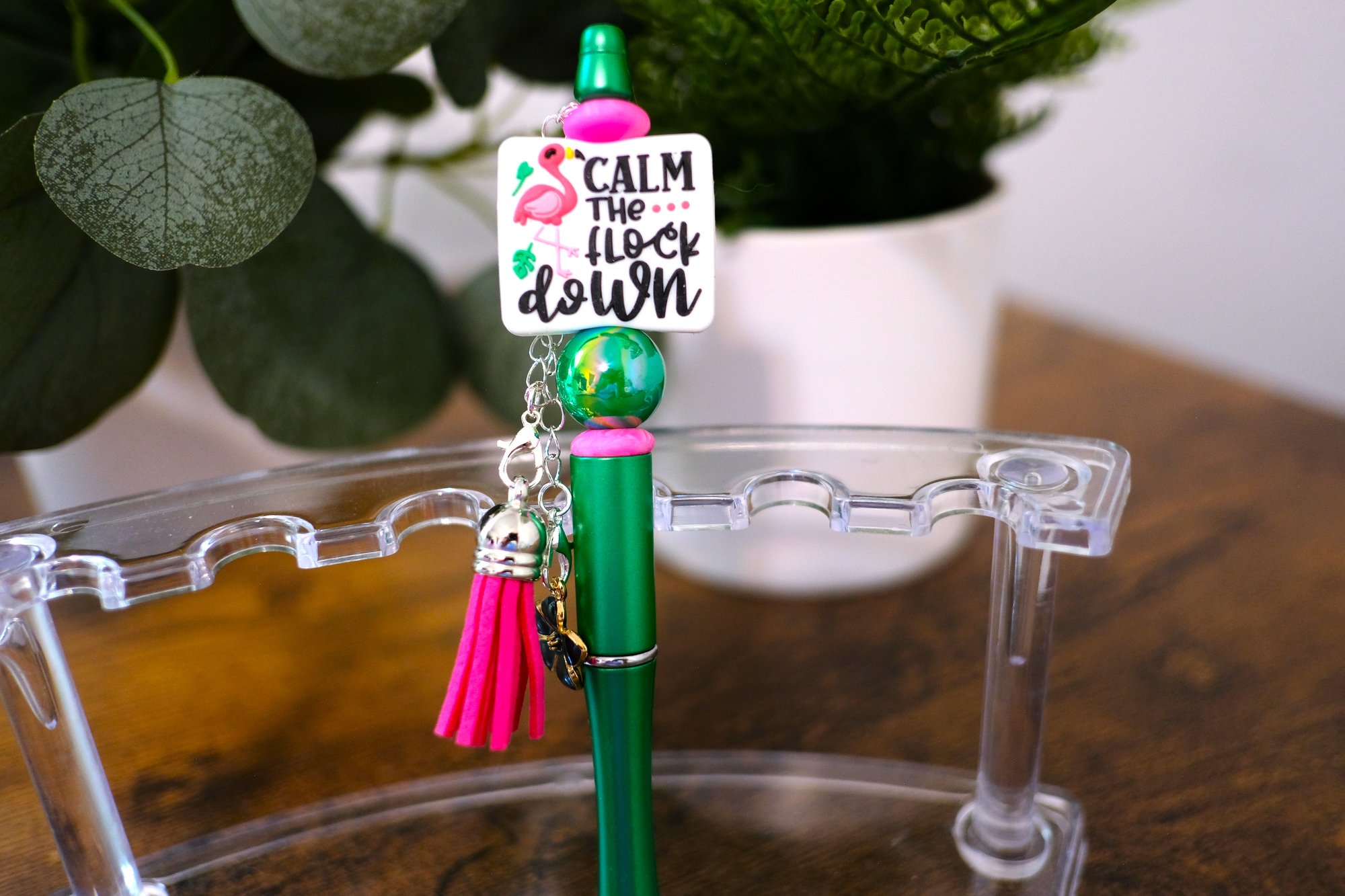 * Green pen with green and pink beads and a focal bead (calm the flock down) along with tassel and charm