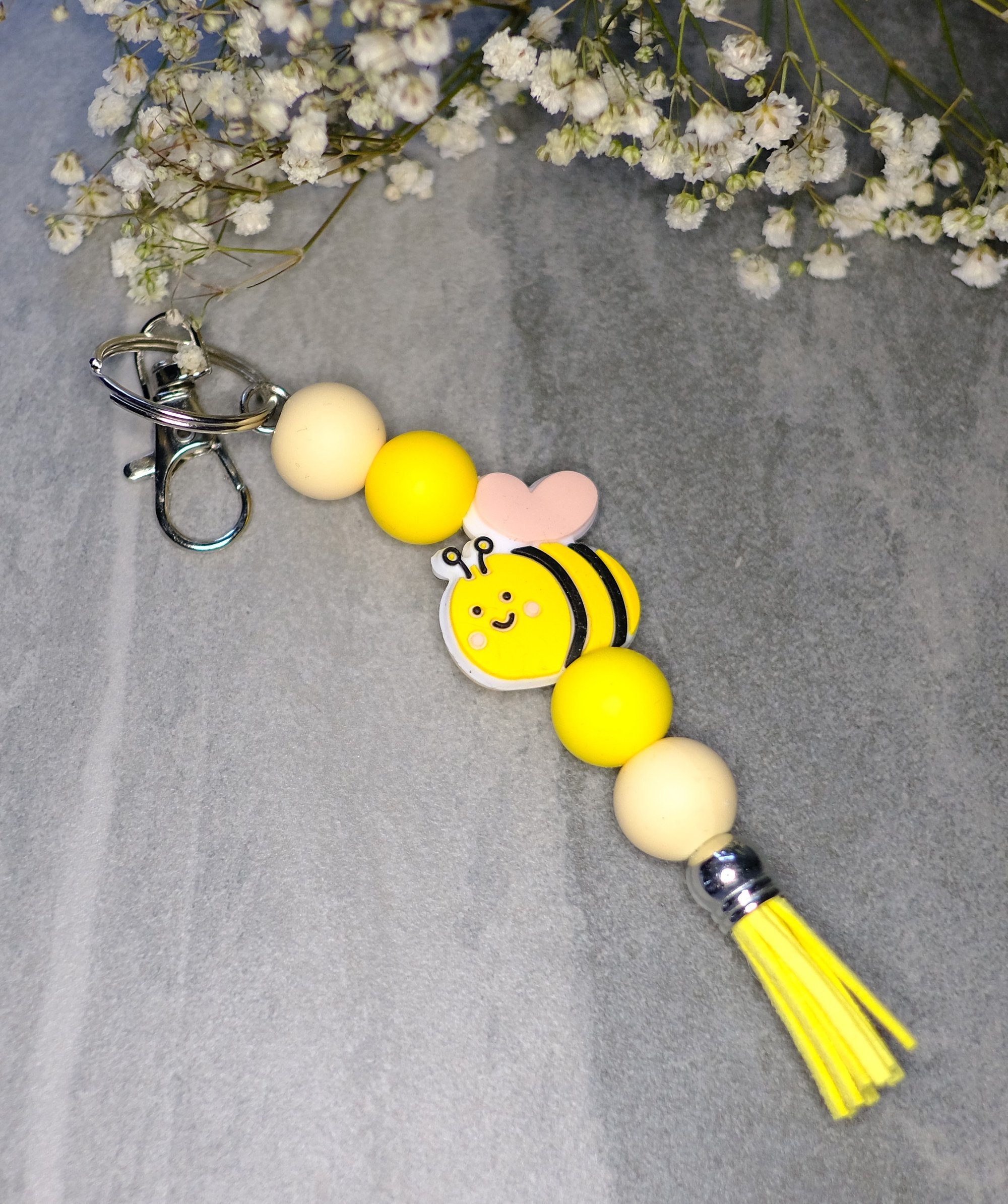 Add to your keys, purse, tote or backpack. Features silicone beads, acrylic beads, wood focal beads, and a matching tassel for a stylish finish. Silver hardware. Key ring and clip.