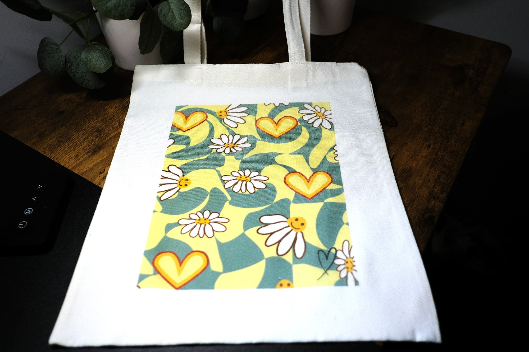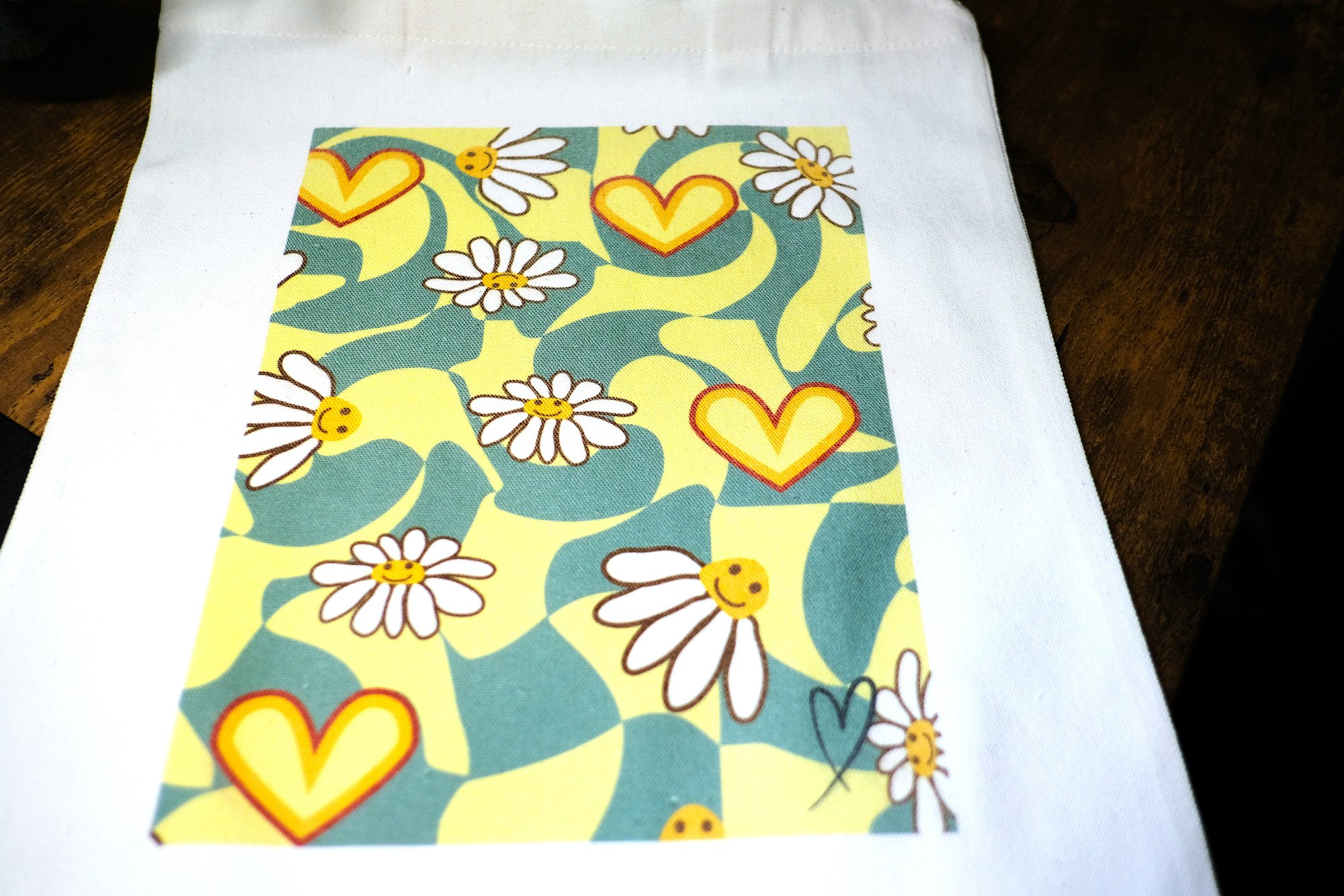 Fun canvas tote bag with happy flowers and hearts. The colors in this design are what really stands out.