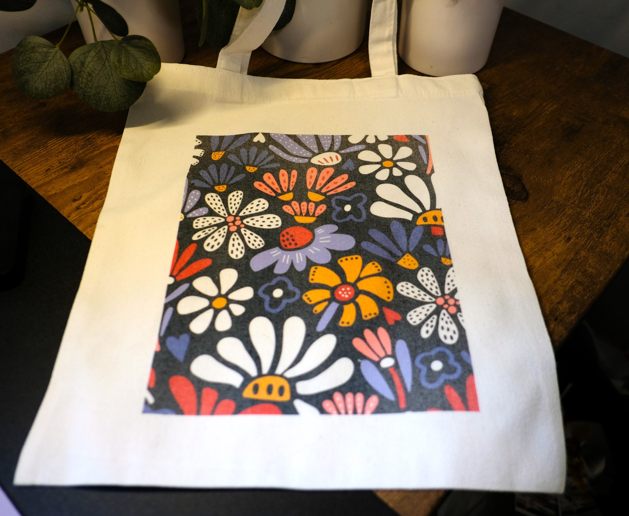 Fun Handmade Retro Flowers Canvas Tote Bag, groceries, books, 70s, reusable, shopping, floral