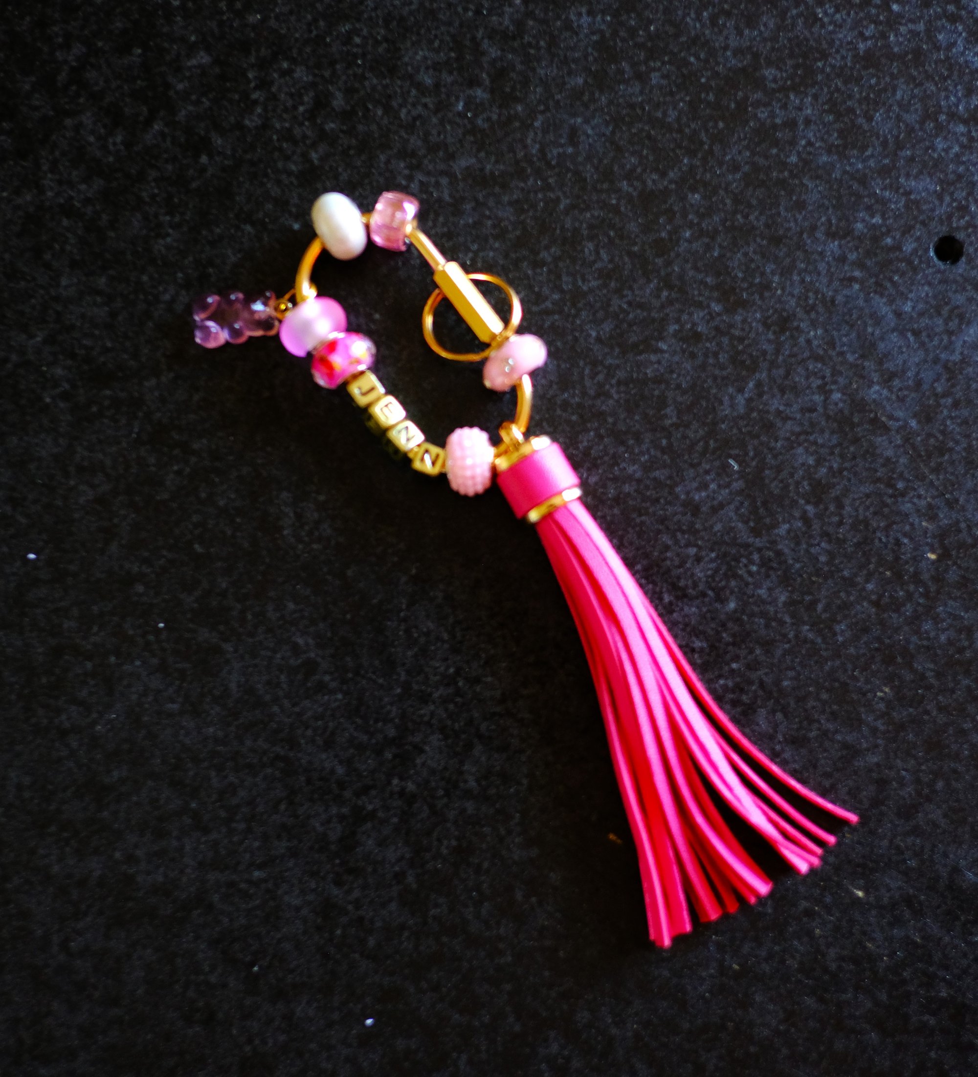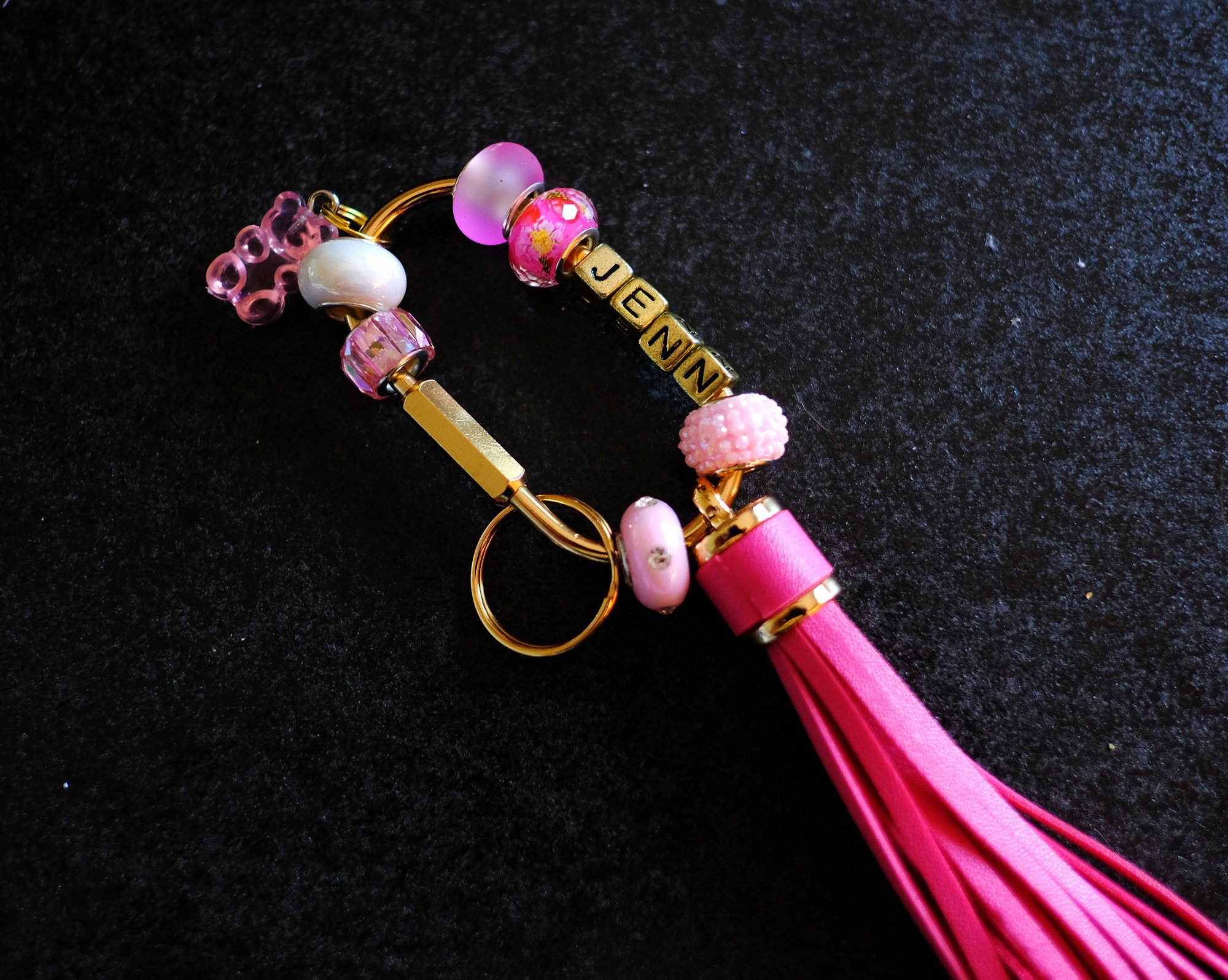 Trendy bright pink handmade beaded keychain. The solid brass key ring construction ensures long-lasting durability. The screw lock is secure and easy to use. It's multi-purpose and fashionable. You can, of course, use it for your keys, but it's also fun to attach it to your bag or backpack. You can even attach it to the handle of your tumbler. Show off your style. It features 6 beautiful beads, a leather tassel and some matching charms.