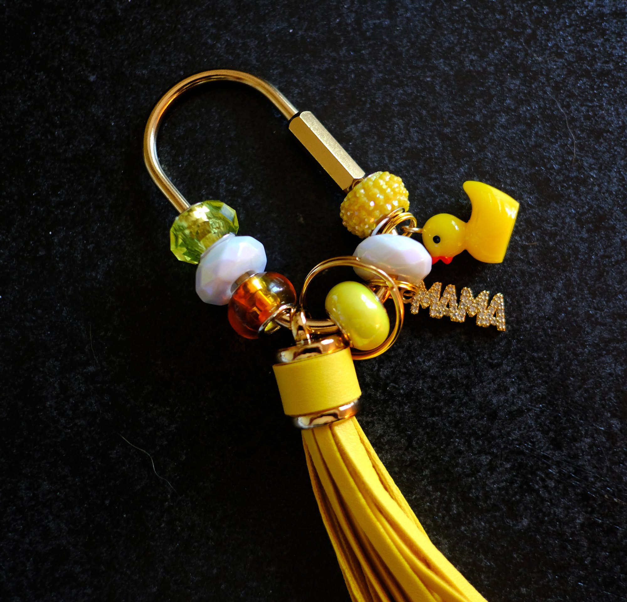 Trendy yellow handmade beaded keychain. The solid brass key ring construction ensures long-lasting durability. The screw lock is secure and easy to use. It's multi-purpose and fashionable. You can, of course, use it for your keys, but it's also fun to attach it to your bag or backpack. You can even attach it to the handle of your tumbler. Show off your style. It features 6 beautiful beads, a leather tassel and some matching charms.