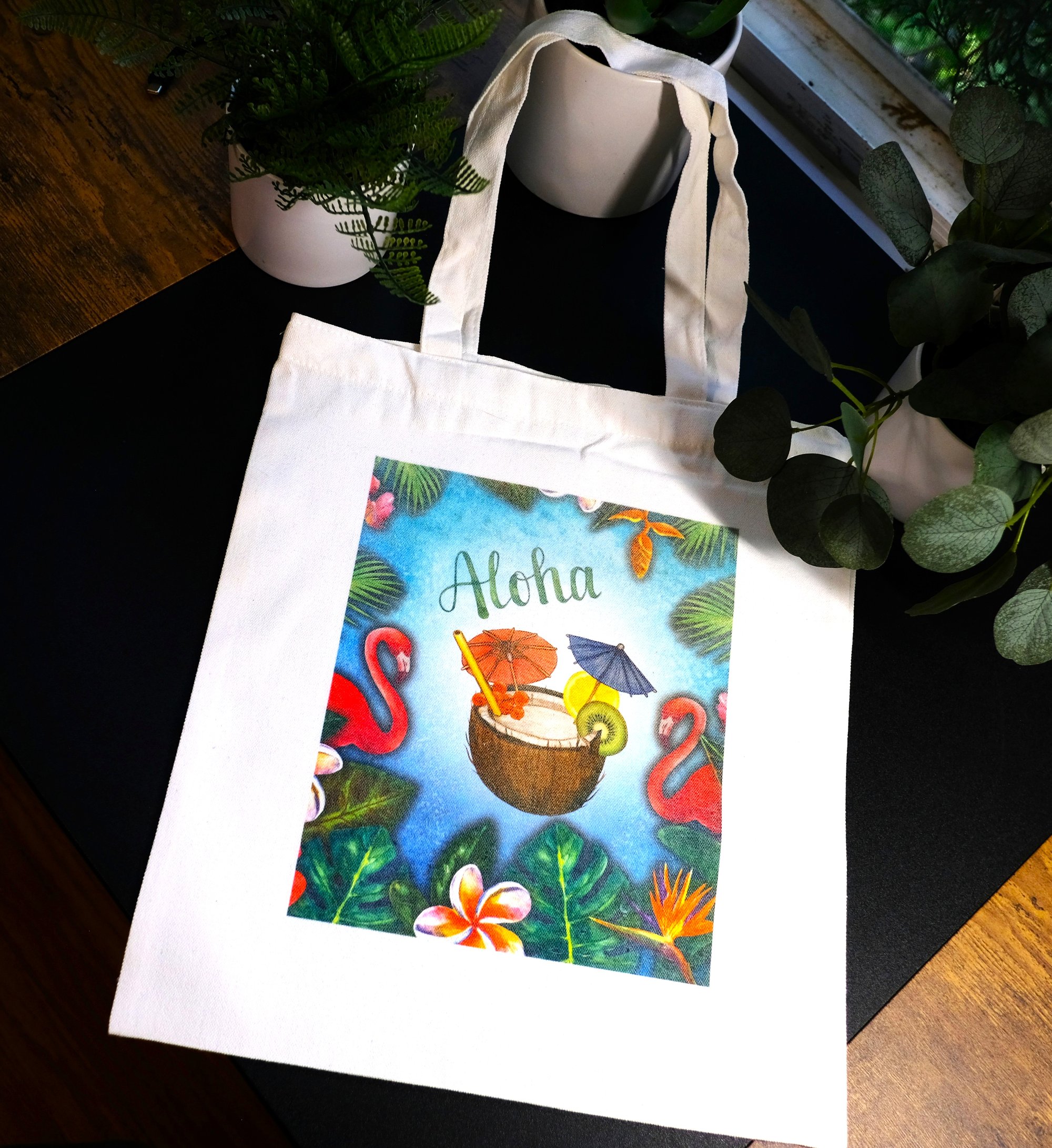 Handmade Aloha Tropical Canvas Tote Bag, grocery, reusable, vacation, books, gift, shopping, beach