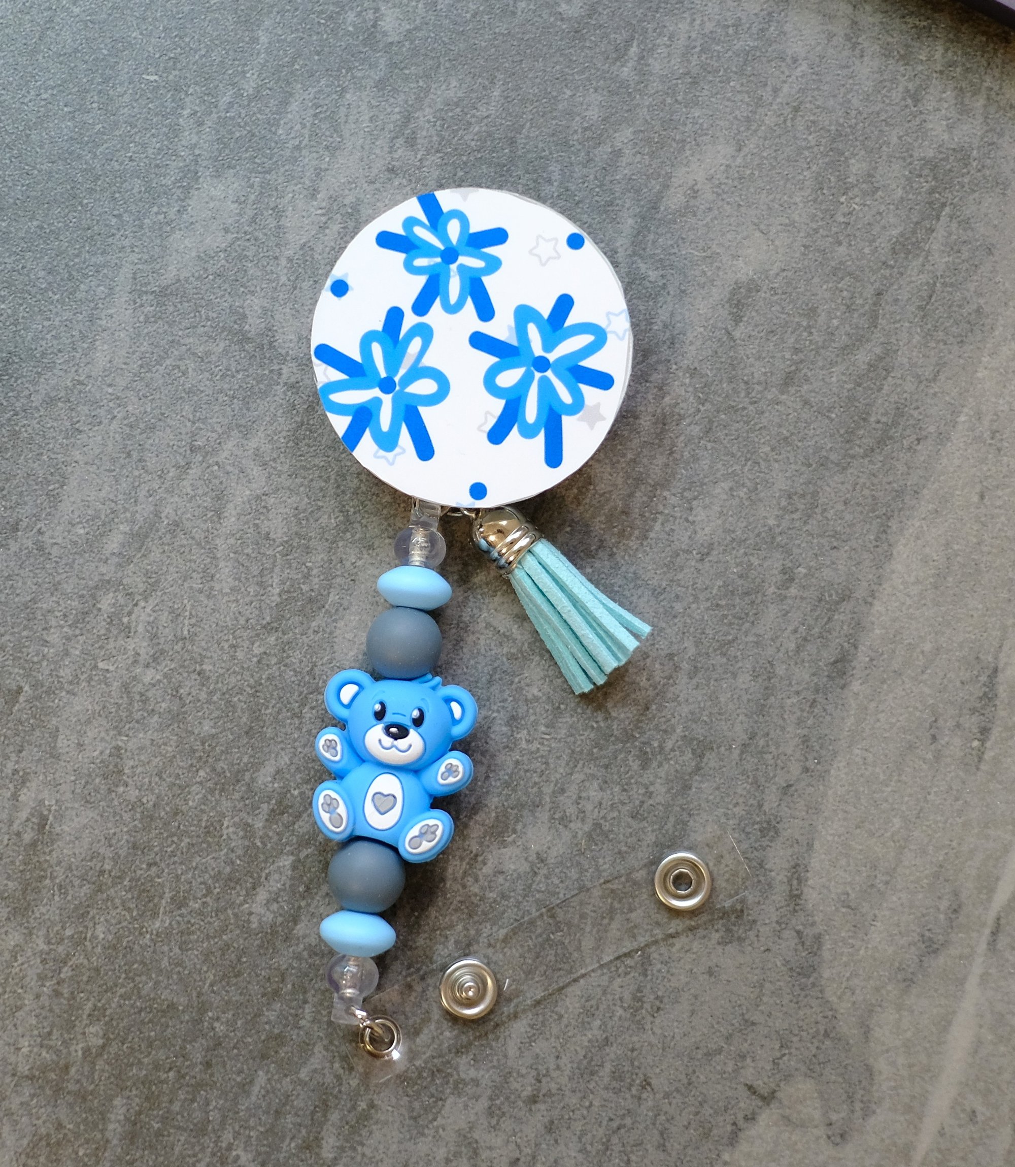 Handmade Beaded Badge Reel, blue, bear, retractable, clip, nurse, teacher, charms, tassel