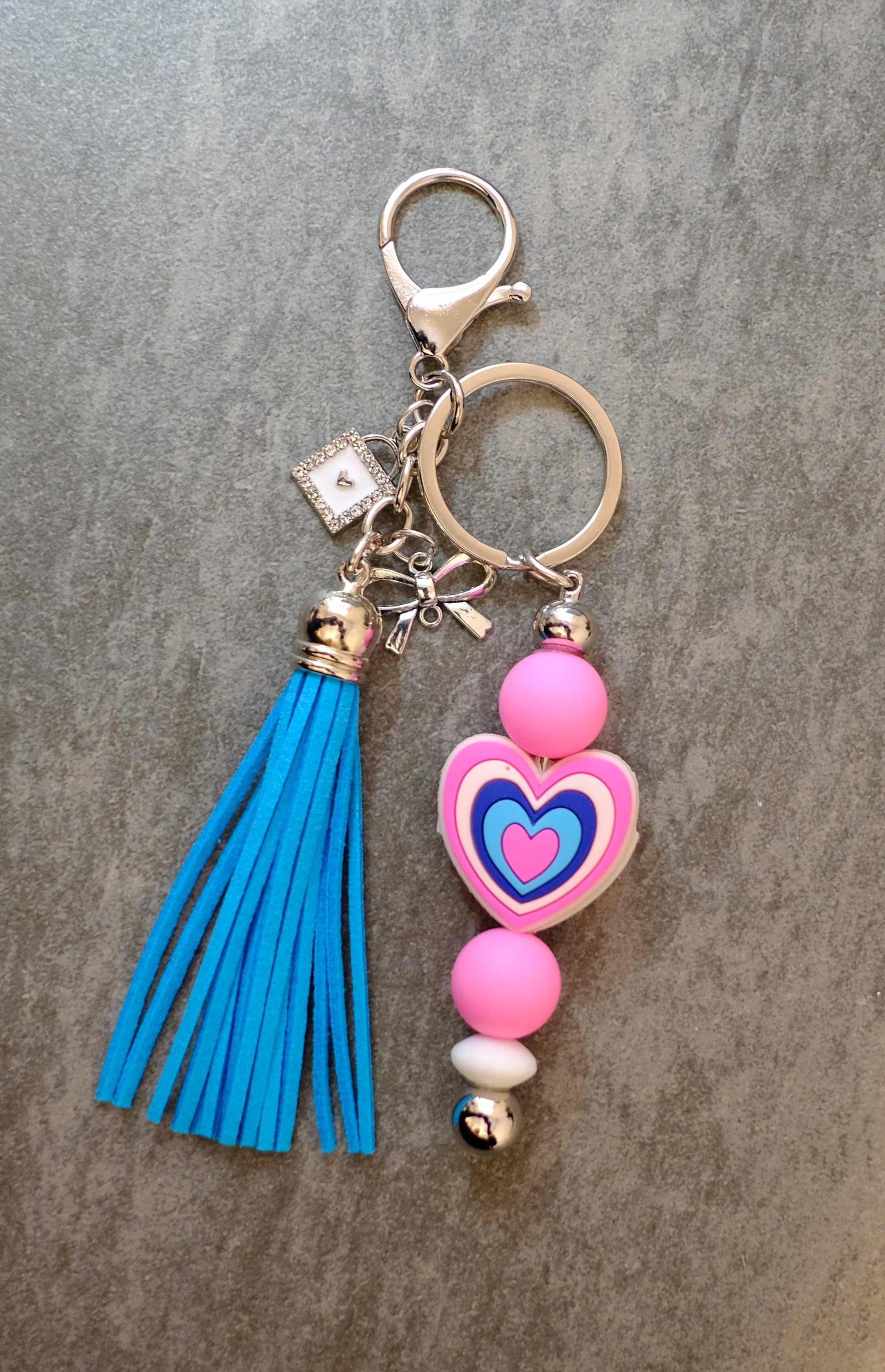 Trendy handmade beaded keychain. Featuring a heart focal bead, a long tassel and a couple of fun charms.