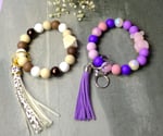 Add to your keys, purse, tote or backpack. Features silicone beads, acrylic beads, wood beads, focal beads, and a matching tassel for a stylish finish. Silver or gold hardware. Key ring and clip.