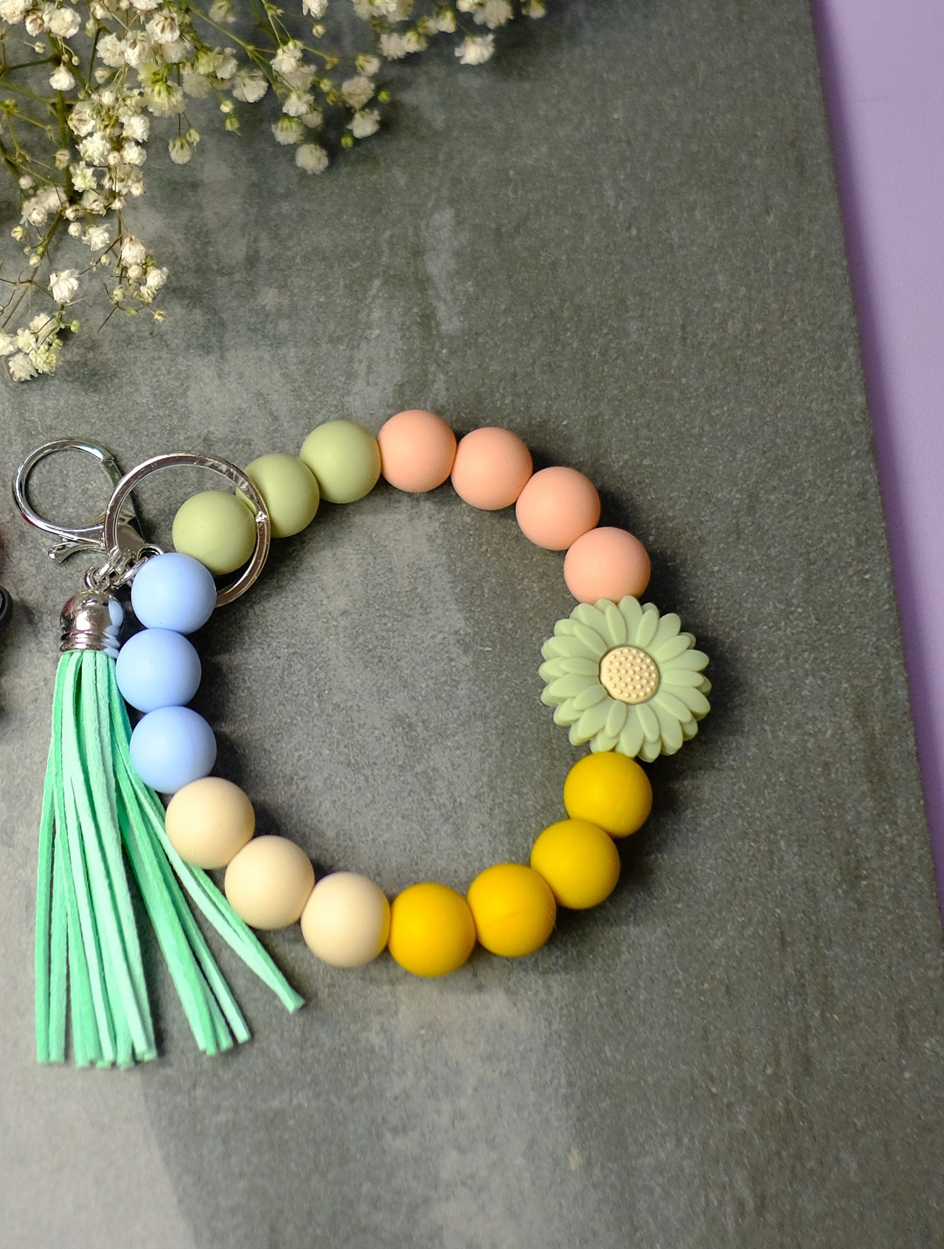 Add to your keys, purse, tote or backpack. Features silicone beads, focal beads, and a matching tassel for a stylish finish. Silver hardware. Key ring and clip.