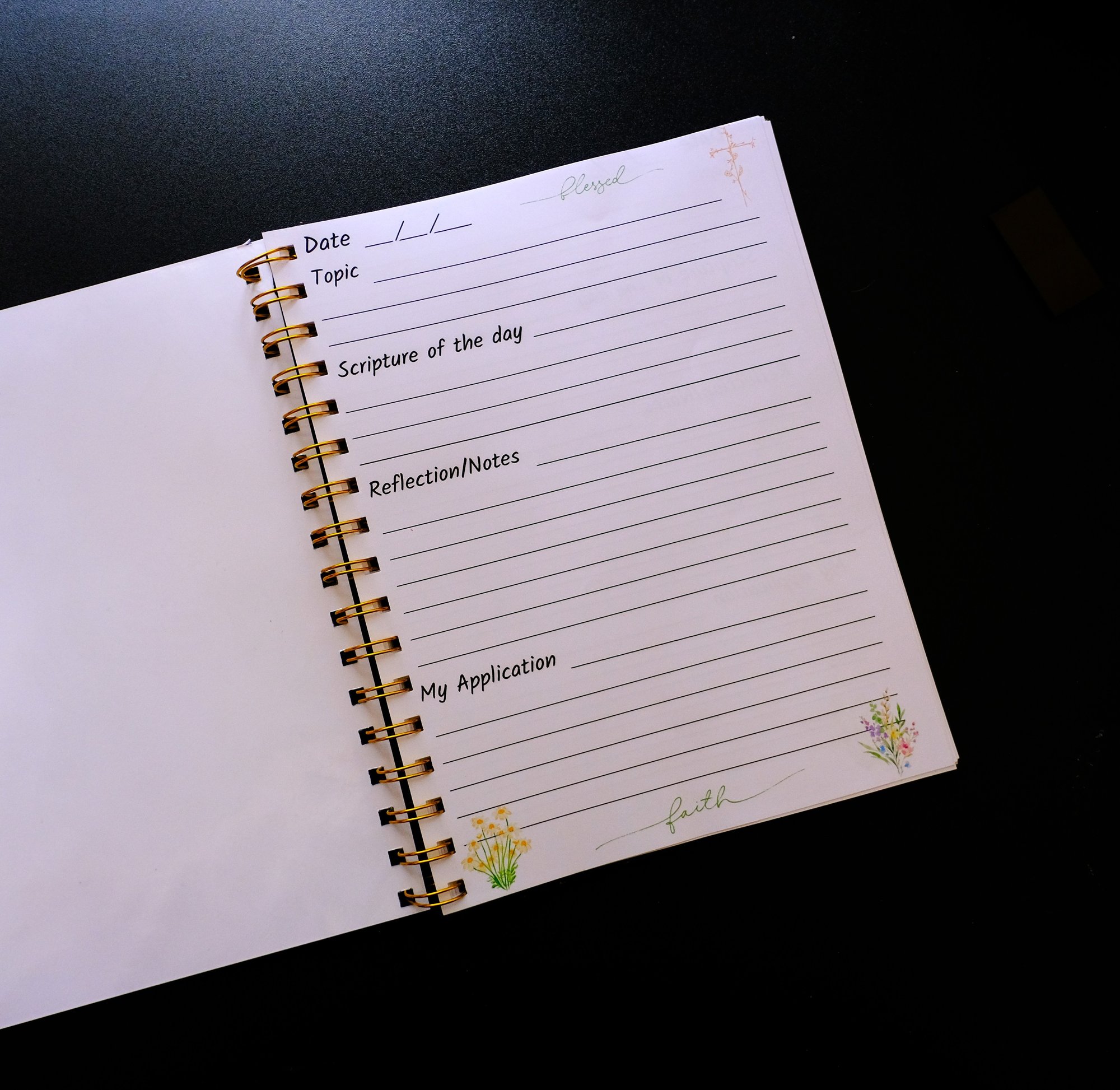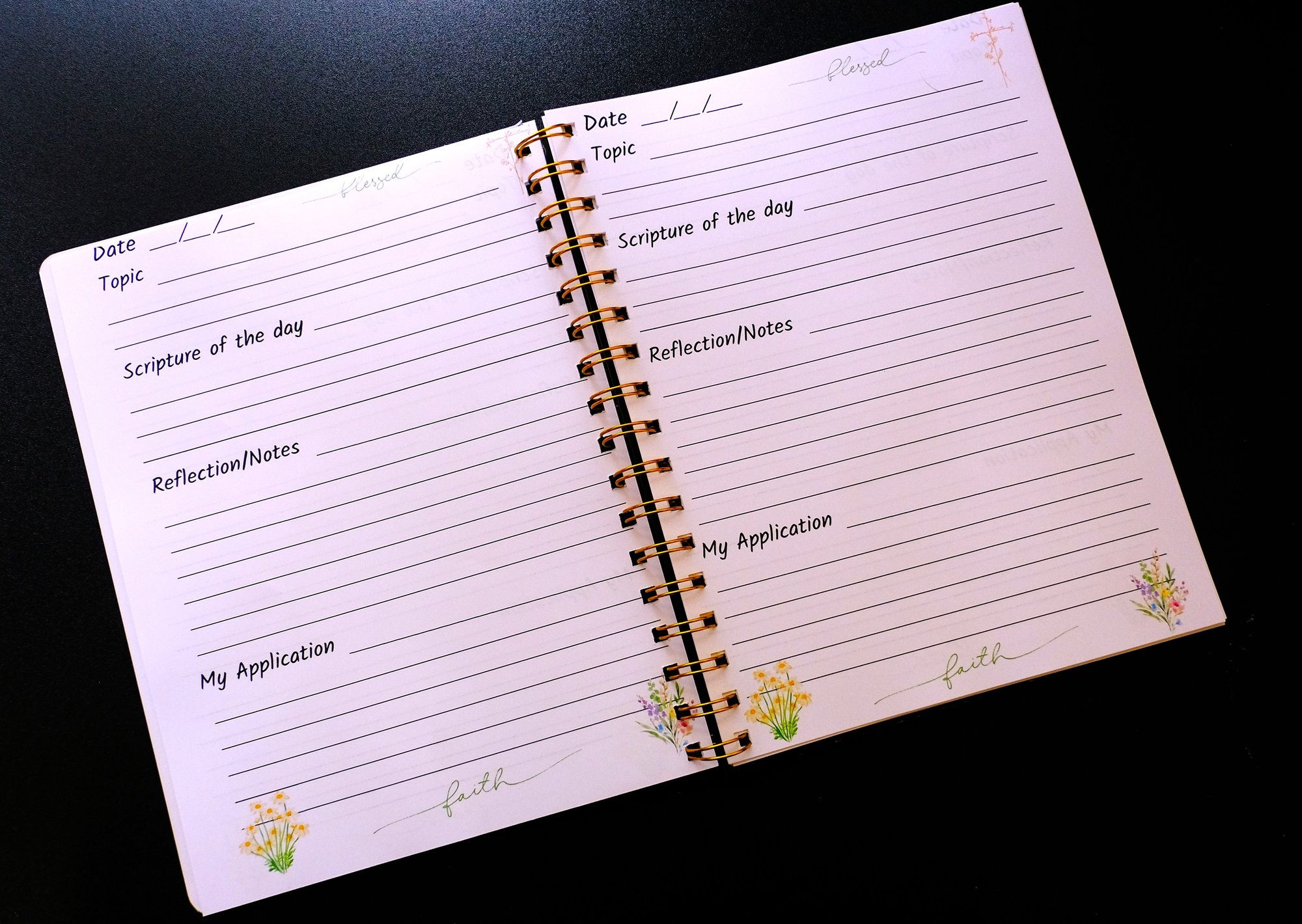 Beautiful handmade church notes spiral bound notebook. Bring your notebook with you every Sunday to church. It's great to take notes in church so you can reflect on the word of God all week. There is a Topic section, Scripture of the Day, Reflection/Notes and My Application sections. 25 double-sided pages.