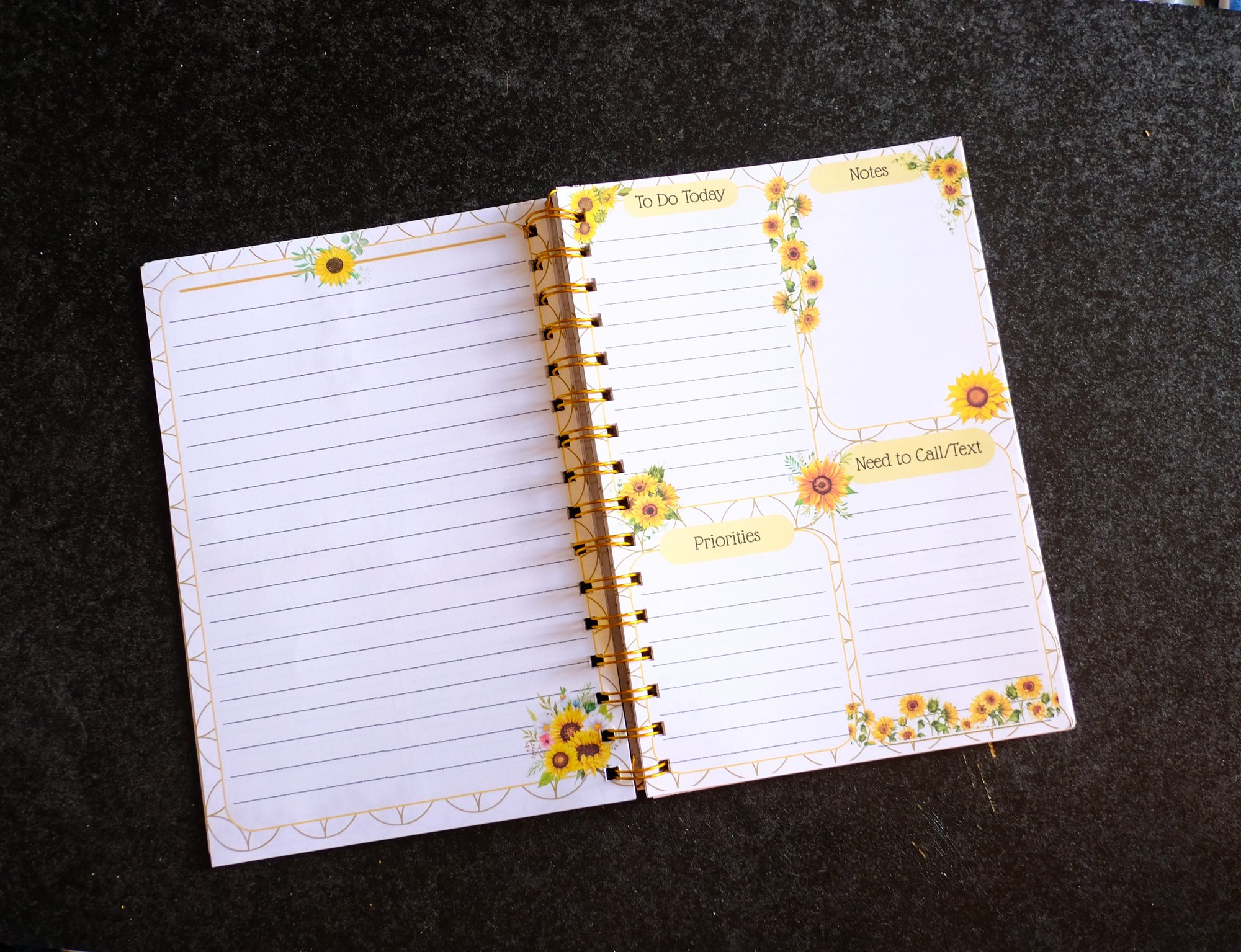 Pretty handmade colorful spiral bound notebook. The design theme is all sunflowers. The design includes beautiful flowers and accents to match along with affirmations. Some of the features of this planner are a To Do Today, Priorities, Notes, Need to call/Text and extra lined space to write your thoughts of the day. 50 double sided pages.