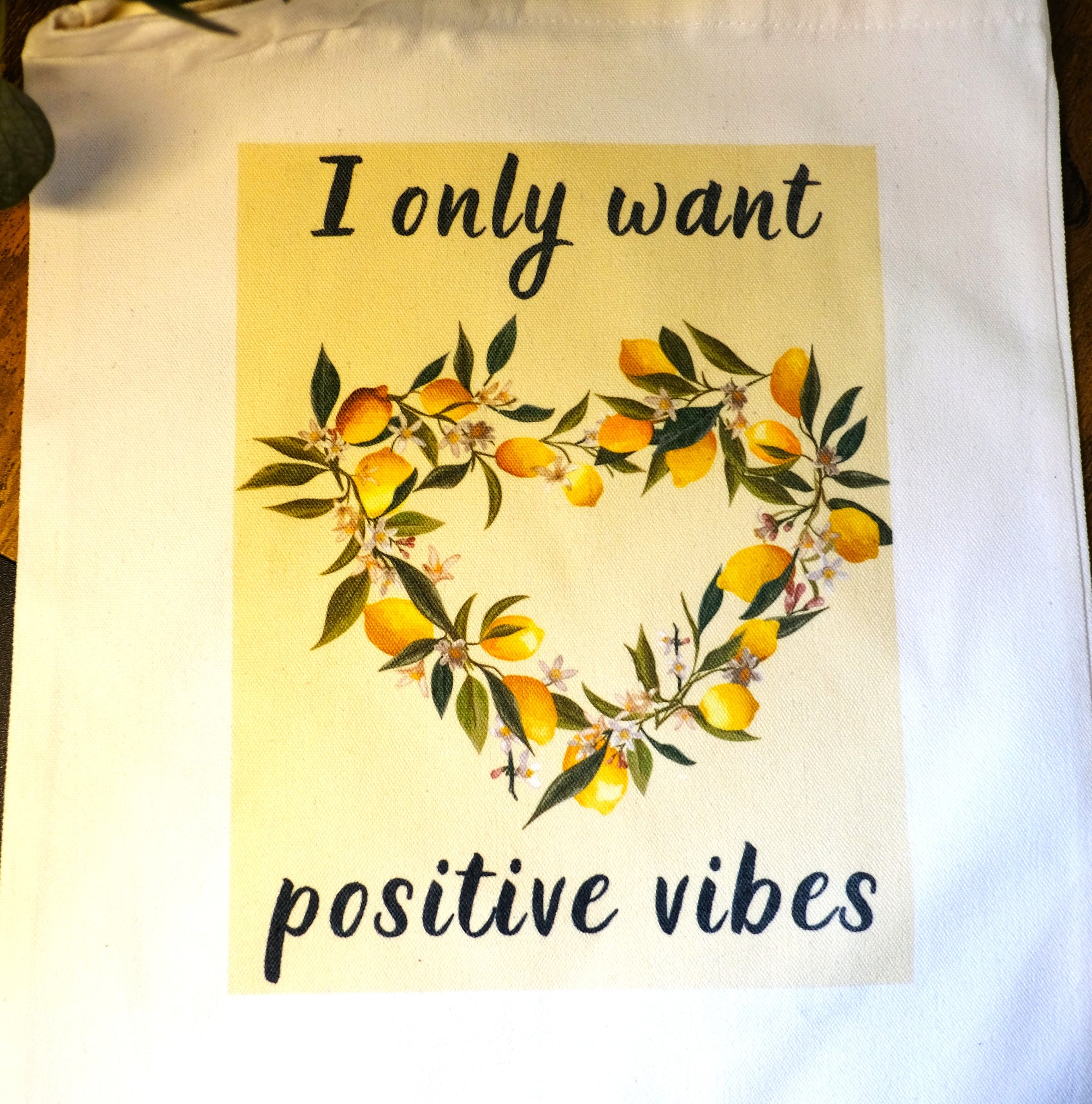 Gorgeous handmade I Only Want Positive Vibes canvas tote bag with a beautiful lemon wreath. You can keep this bag for yourself or gift it as a beautiful gift.