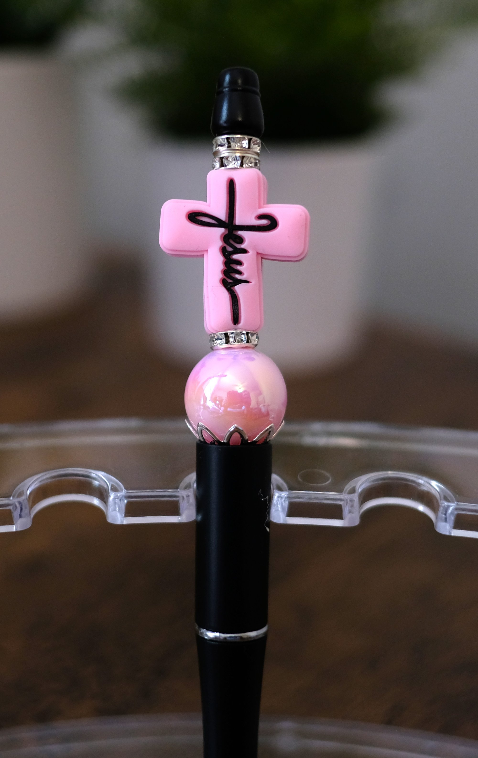 Beautiful light pink Jesus cross beaded pen. The pen itself is black. It features a pretty pink acrylic bead. These are ball point pens with black ink. Twist the bottom of the pen to expose the ball point part of the pen. The pen is very trendy. It makes writing in your journal, planner, paperwork and everyday use cheerful and fun. They are made with silicone, and glass beads. I've also included a tassel and a pink charm.