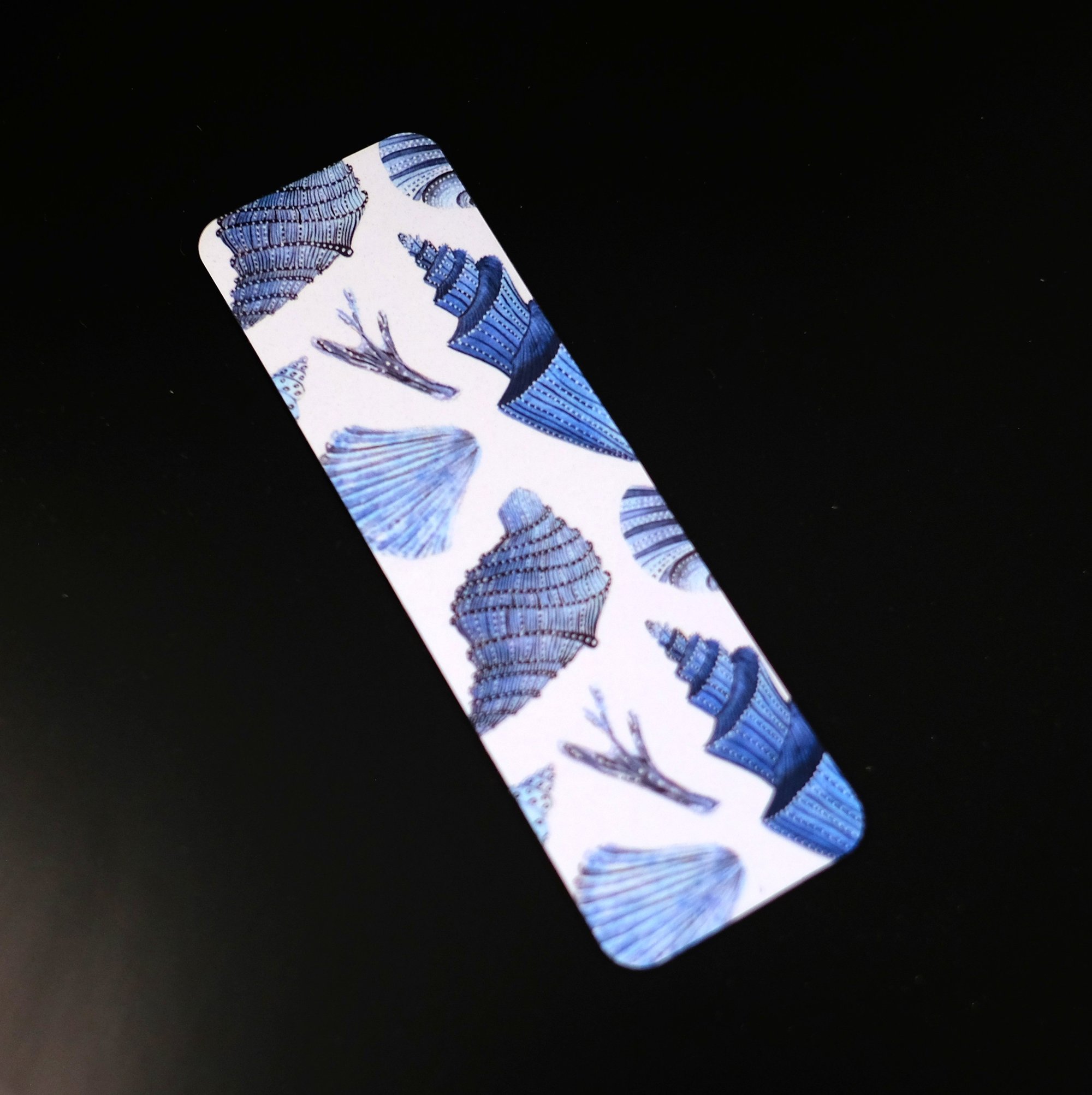 Fun and trendy handmade magnetic bookmark. Features beautiful blue seashells. The size of the bookmark is approx 1 1/2" x 4 1/2" open flat. It is approx 1 1/2" x 2" when folded over a page. The design is on one side. It is applied using the sublimation process which means it will not fade. The design is self-made and is a one of a kind. It would be great to use in your journal, planner and notebook.