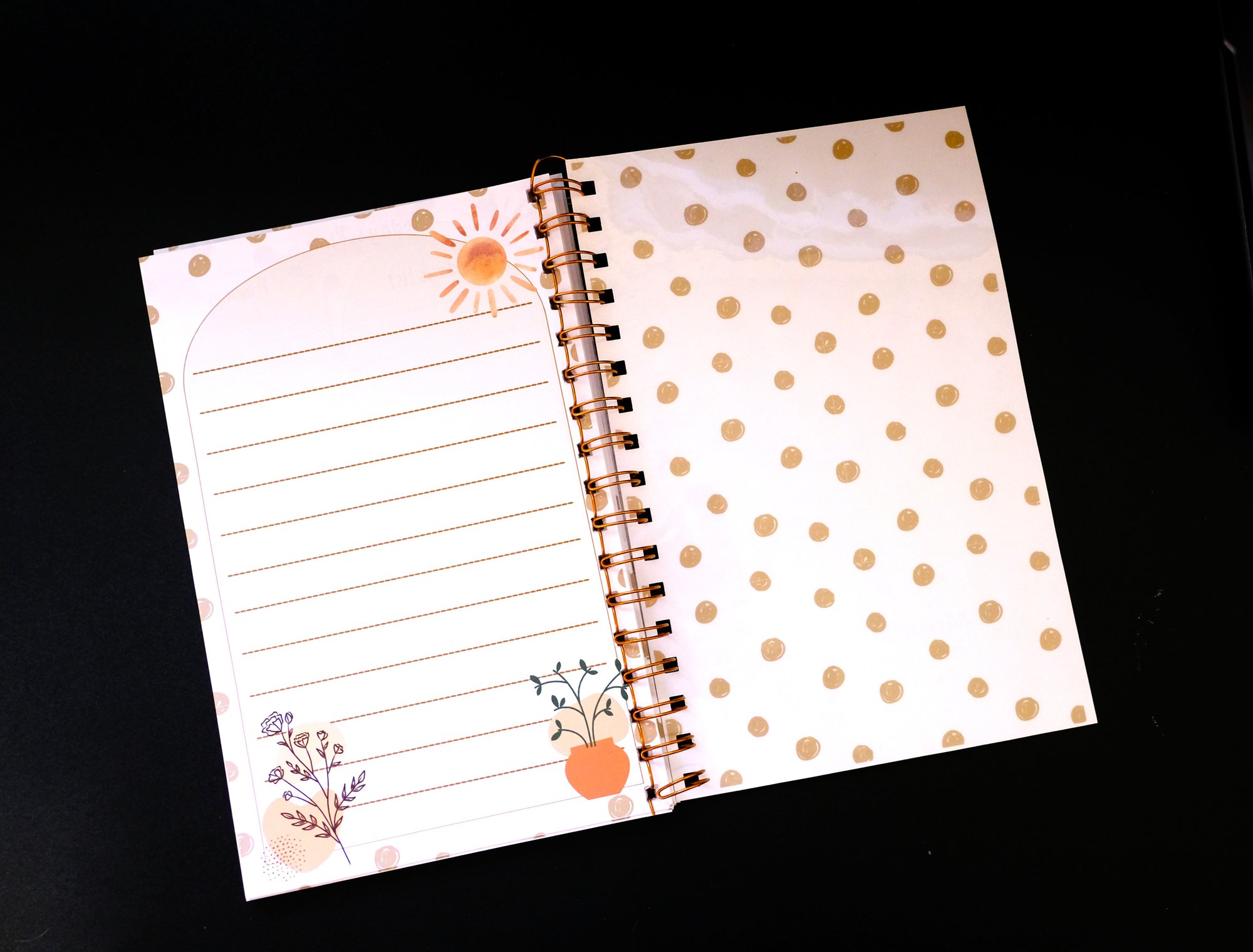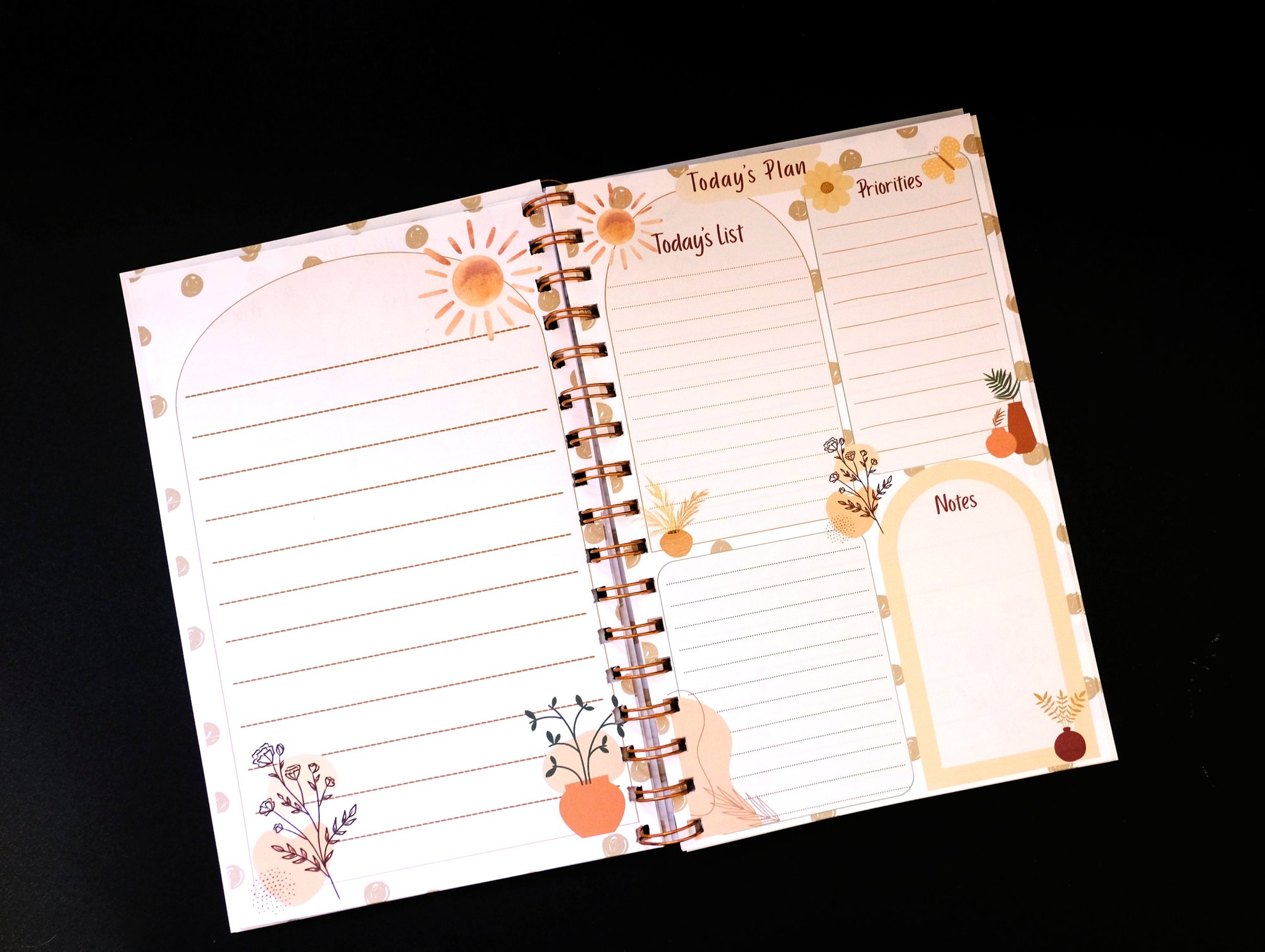 Very cool handmade boho style spiral bound notebook. The design includes neutral colors, plants and poka dots. Some of the features of this planner are Today's List, Priorities and Notes. 50 double sided pages.