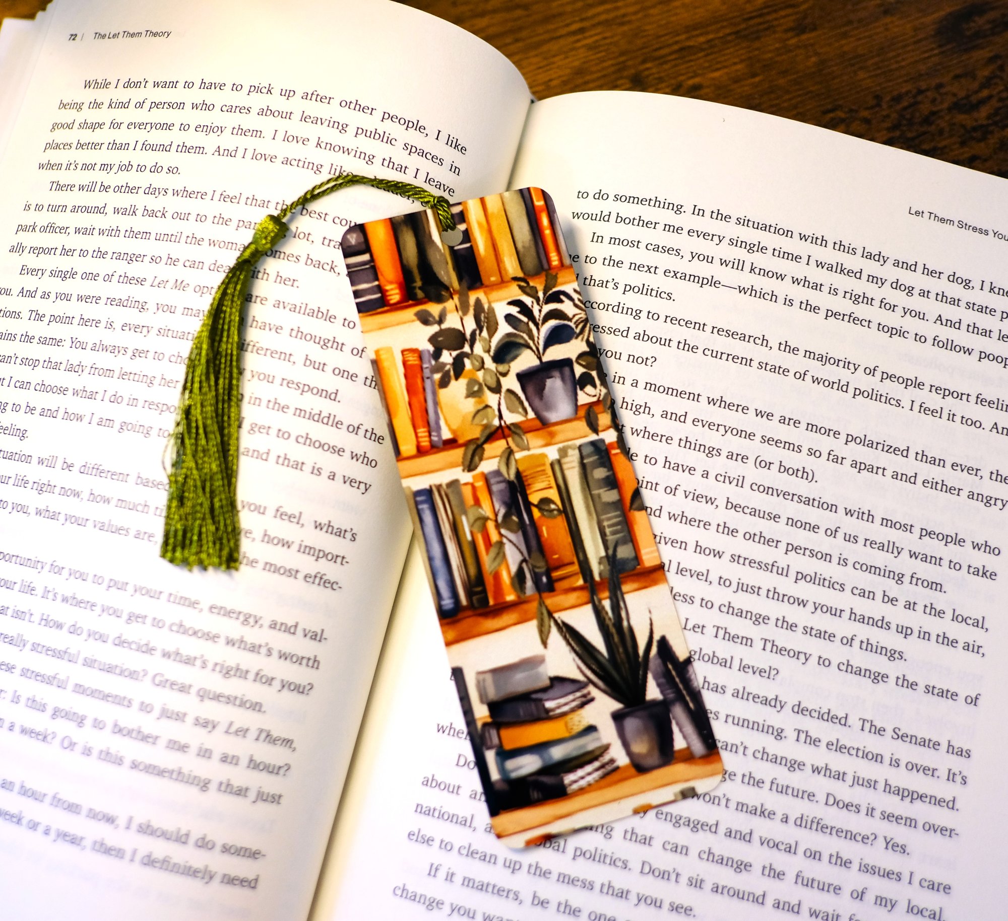 Handmade Book Shelves metal bookmark with green tassel. The size is 2" x 5 1/2". The design is on one side. The handmade design is applied using the sublimation process which means it will not fade.