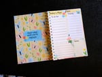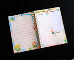 Pretty handmade colorful spiral bound notebook. The design includes beautiful butterflies and flowers. Some of the features of this planner are a To Do List, Priorities, Notes and extra lined space to write your thoughts of the day. 50 double sided pages.
