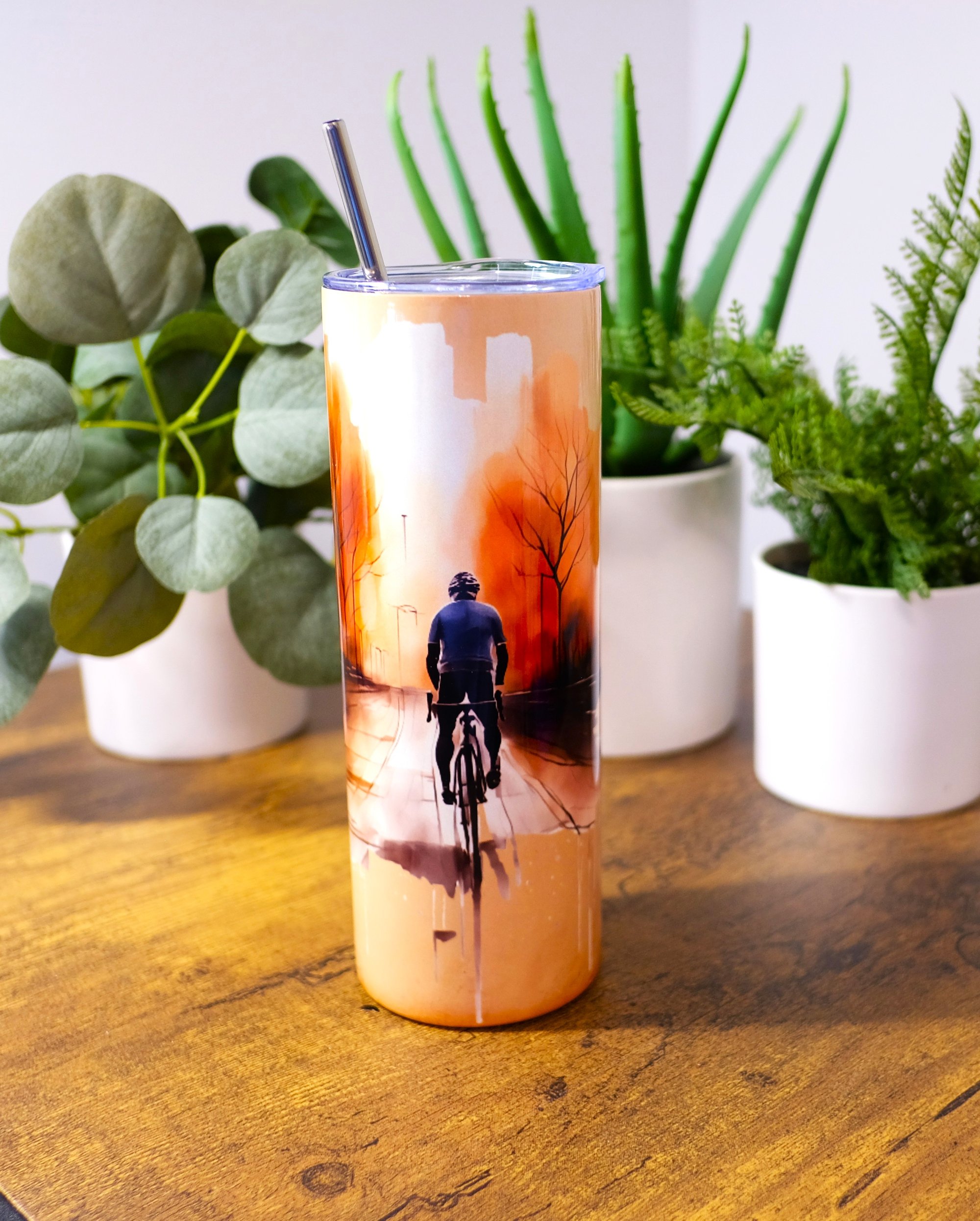Cyclist with beautiful background handmade 20oz stainless steel tumbler.