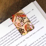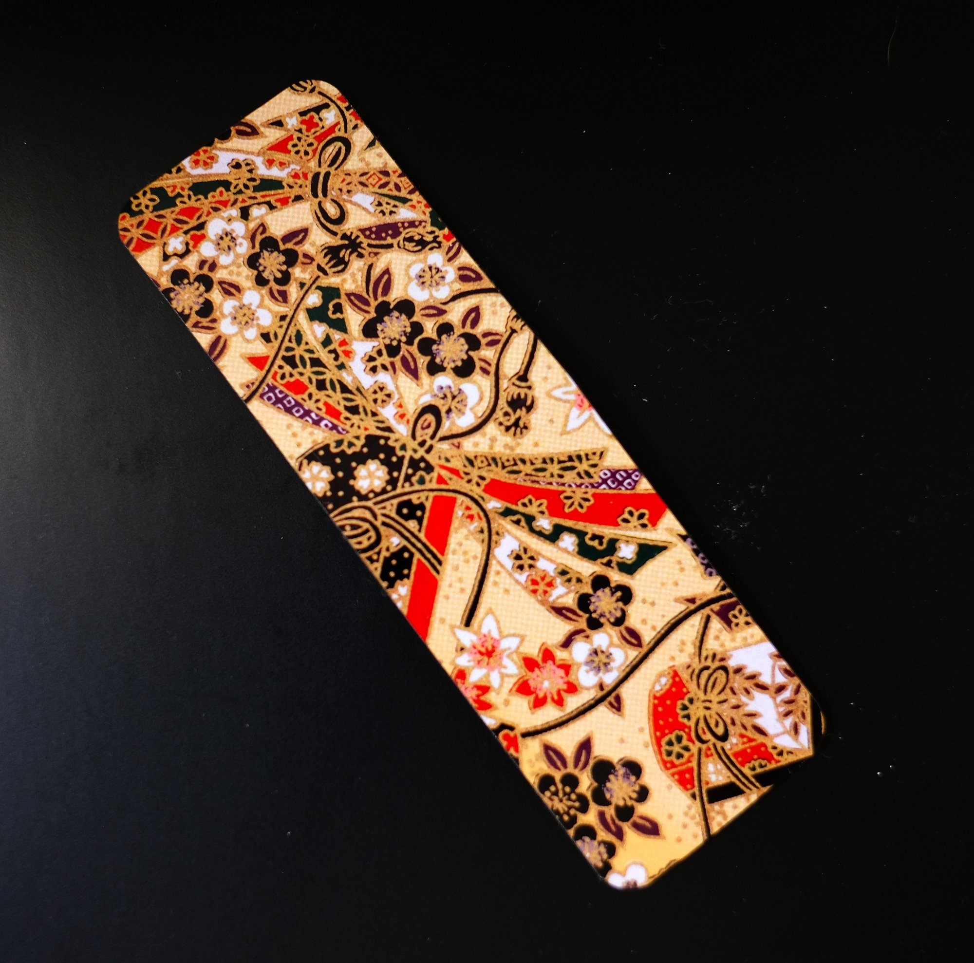 Handmade colorful magnetic bookmark. Features a Japanese inspired pattern with red, black and gold colors. The size of the bookmark is approx 1 1/2" x 4 1/2" open flat. It is approx 1 1/2" x 2" when folded over a page. The design is on one side. It is applied using the sublimation process which means it will not fade. The design is self-made and is a one of a kind. It would be great to use in your journal, planner and notebook.