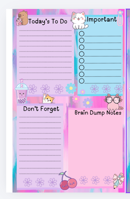 This Kawaii themed Today's To Do notepad features 50 pages with 4 sections: Today's To Do, Brain Dump, Don't Forget and Important. Beautiful colors will illuminate your desk or workspace giving an uplifting boost to your day. The pad measures approximately 5.3" x 8.5". (some sizes may vary slightly because of the design) All my stationery notepads are made with high quality paper and a sturdy backing for stable writing. Smooth writing with no bleed-through.