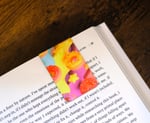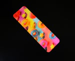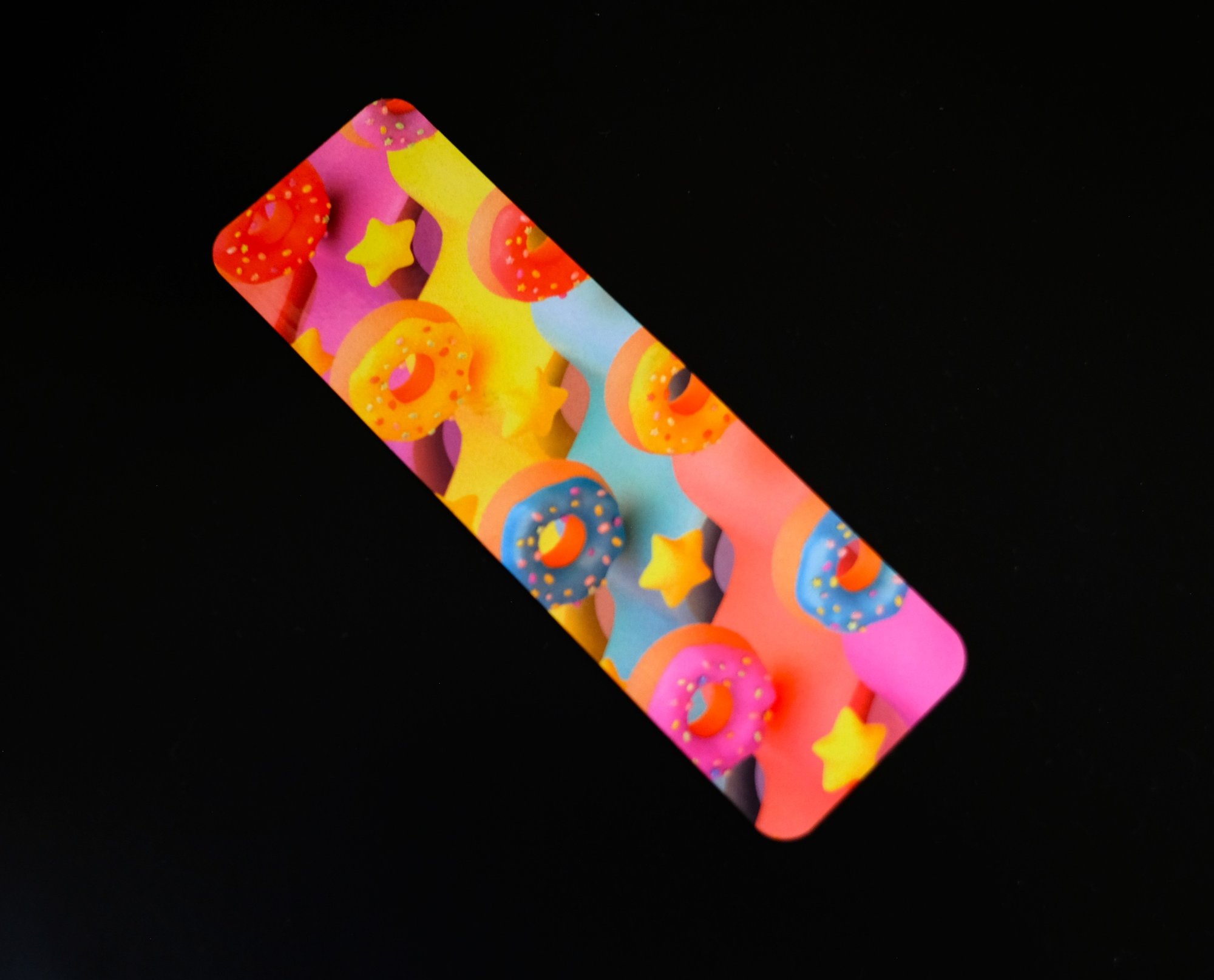 Fun and trendy handmade magnetic bookmark. This one has a very coloful design including donuts and stars. The size of the bookmark is approx 1 1/2" x 4 1/2" open flat. They are approx 1 1/2" x 2" when folded over a page. The design is on one side. It is applied using the sublimation process which means it will not fade. The design is self-made and is a one of a kind. It would be great to use in your journal, planner and notebook.