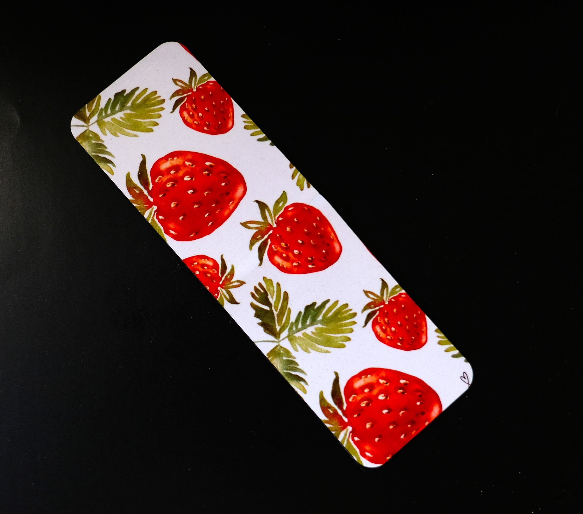 Beautiful and trendy handmade magnetic bookmark. Features bright red strawberries. The size of the bookmark is approx 1 1/2" x 4 1/2" open flat. It is approx 1 1/2" x 2" when folded over a page. The design is on one side. It is applied using the sublimation process which means it will not fade. The design is self-made and is a one of a kind. It would be great to use in your journal, planner and notebook.