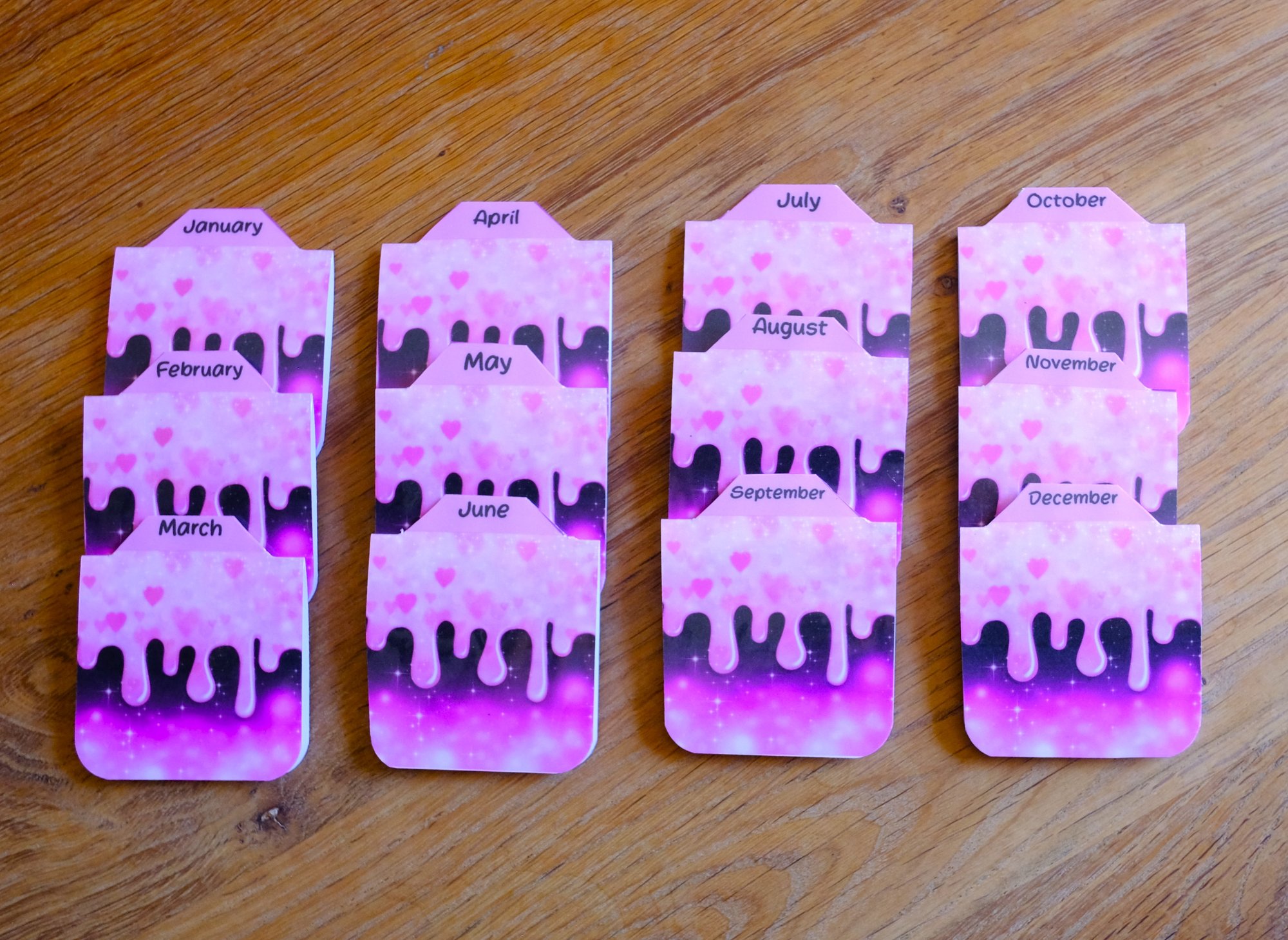 Pretty and fun magnetic monthly tabs featuring a very cool purple drip design that you can use in your journal and planner. Or you can add them to a plain notebook. They make staying organized fun and efficient. Unlike sticker tabs, these magnetic tabs won't tear pages or leave any residue, making them ideal for planners/journals you update often.