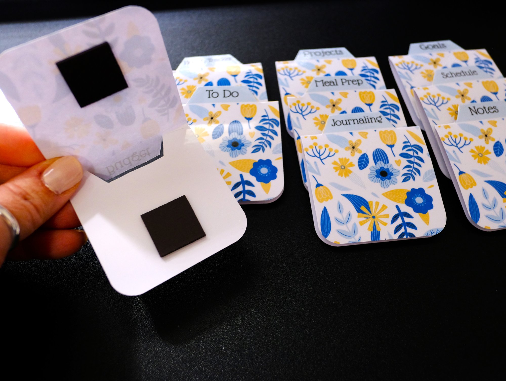 Pretty and fun magnetic tabs featuring blue and yellow florals that you can use in your journal and planner. Or you can add them to a plain notebook. They make staying organized fun and efficient. Unlike sticker tabs, these magnetic tabs won't tear pages or leave any residue, making them ideal for planners/journals you update often.