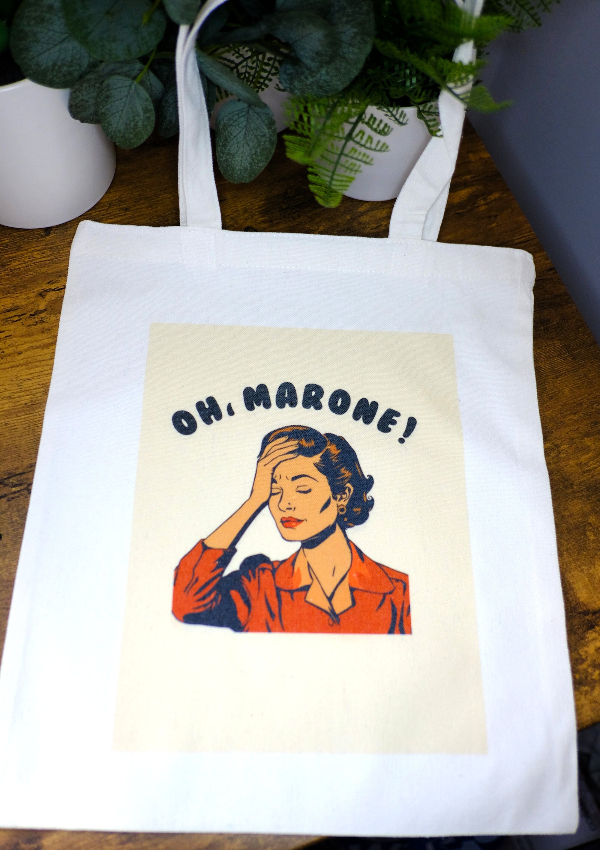 Handmade canvas tote bag with woman holding her head and the Italian phrase "Oh, Marone!". I will say again, if you're Italian, then you know.