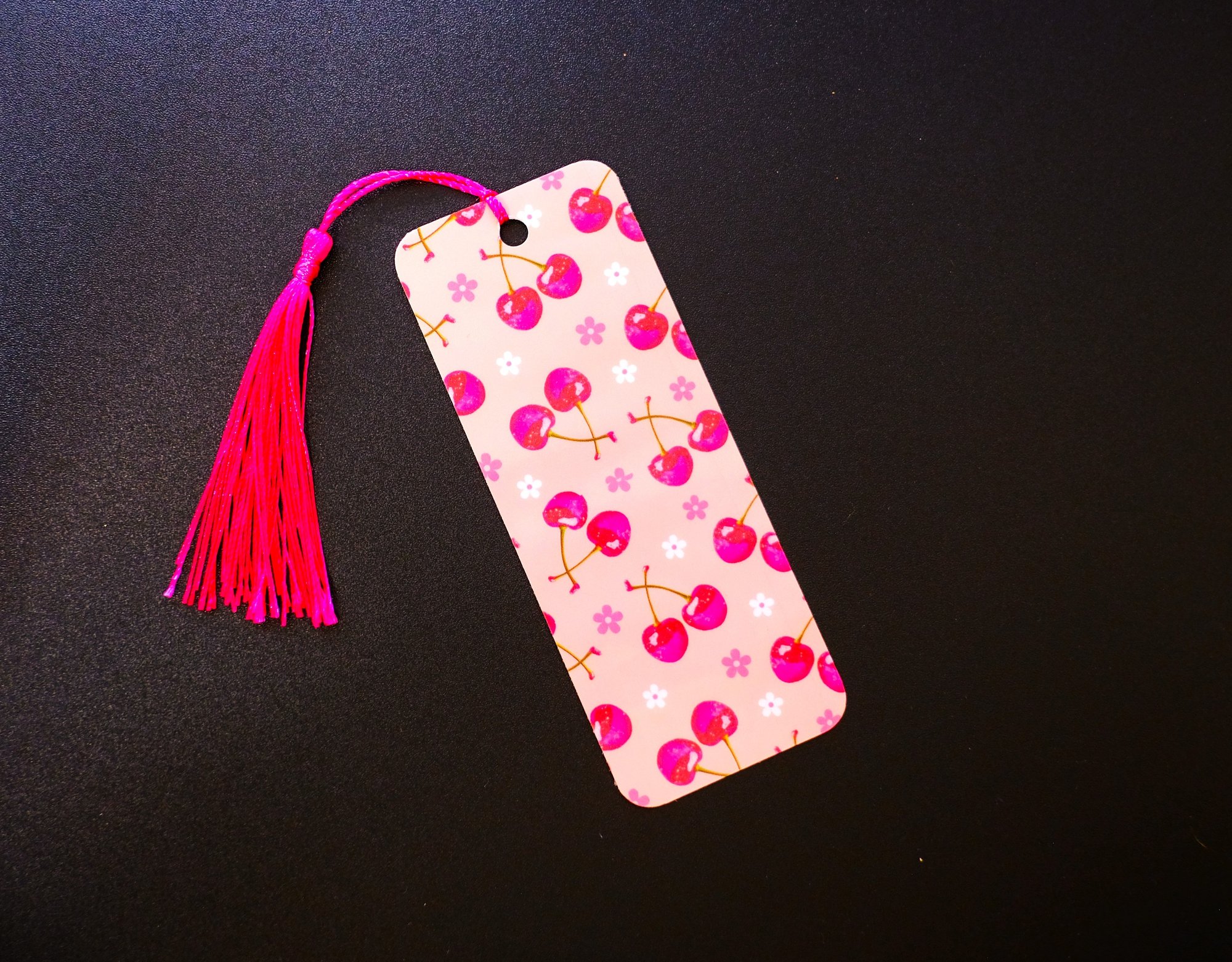 Handmade pretty pink bookmark with fun cherries and a pink tassel. The design is on one side. I design, print and assemble all of my items.