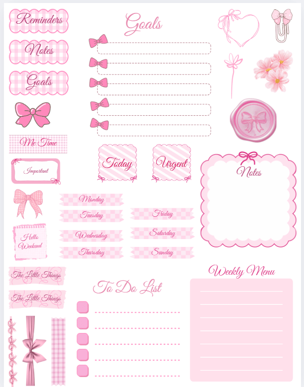Beautiful handmade pink planner / journal stickers. Featuring bows, ribbon, to do list, notes goals days of the week and more.