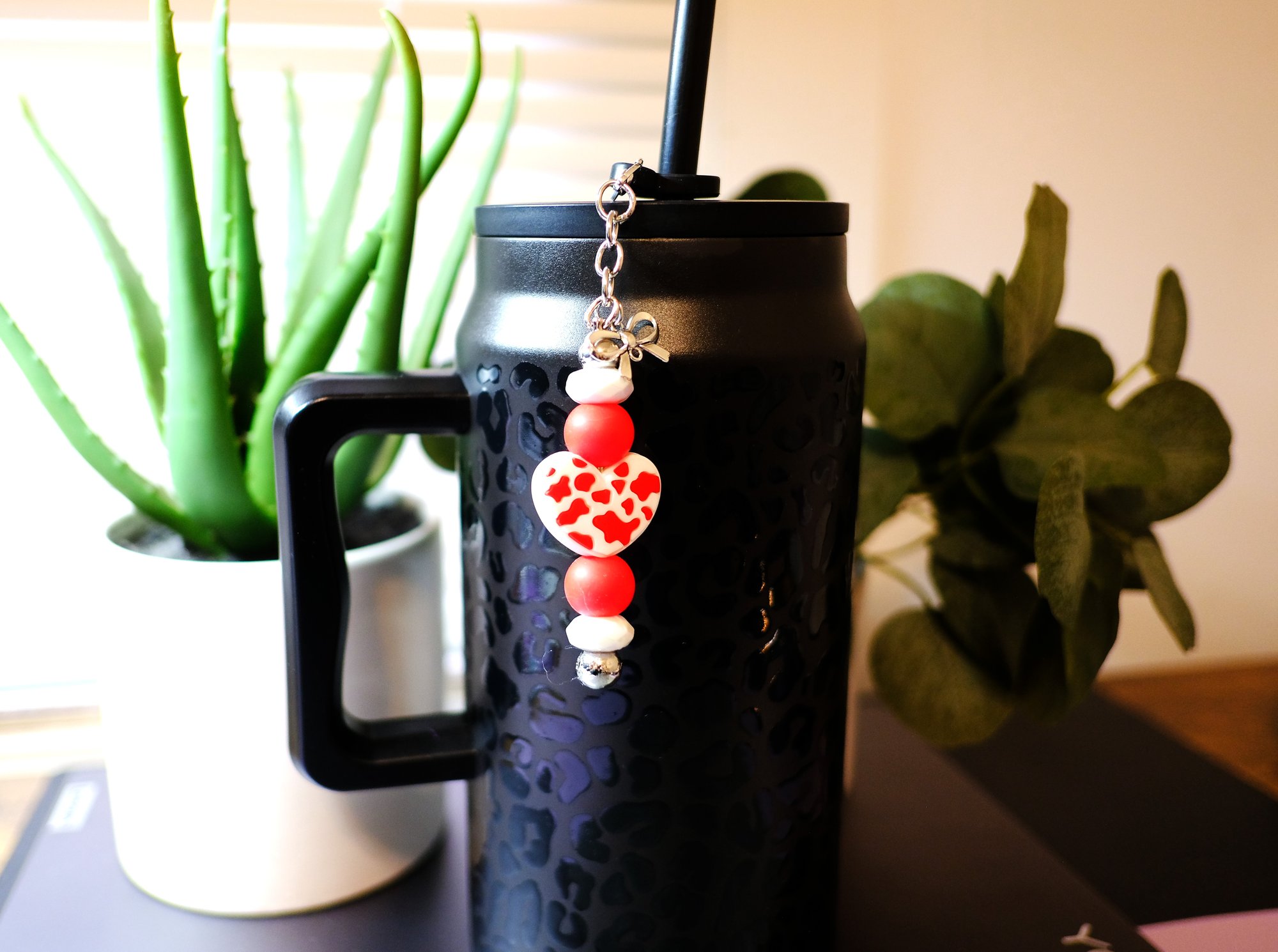 Handmade Red and White Heart Straw Charm with bow, tumbler, Stanley, gift, accessory, charms, cup