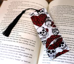 Skulls with red hearts and lips metal bookmark with black tassel. Background is white and the graphics are white, black and red. The size is 2" x 5 1/2". The design is on one side. The handmade design is applied using the sublimation process which means it will not fade.
