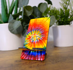 Colorful handmade tie dye cellphone stand/charging dock. The stand measures 3" x 5 1/2". This design is unique and eye catching. The design is on both sides. I used the sublimation process to apply the design which means it will not fade.