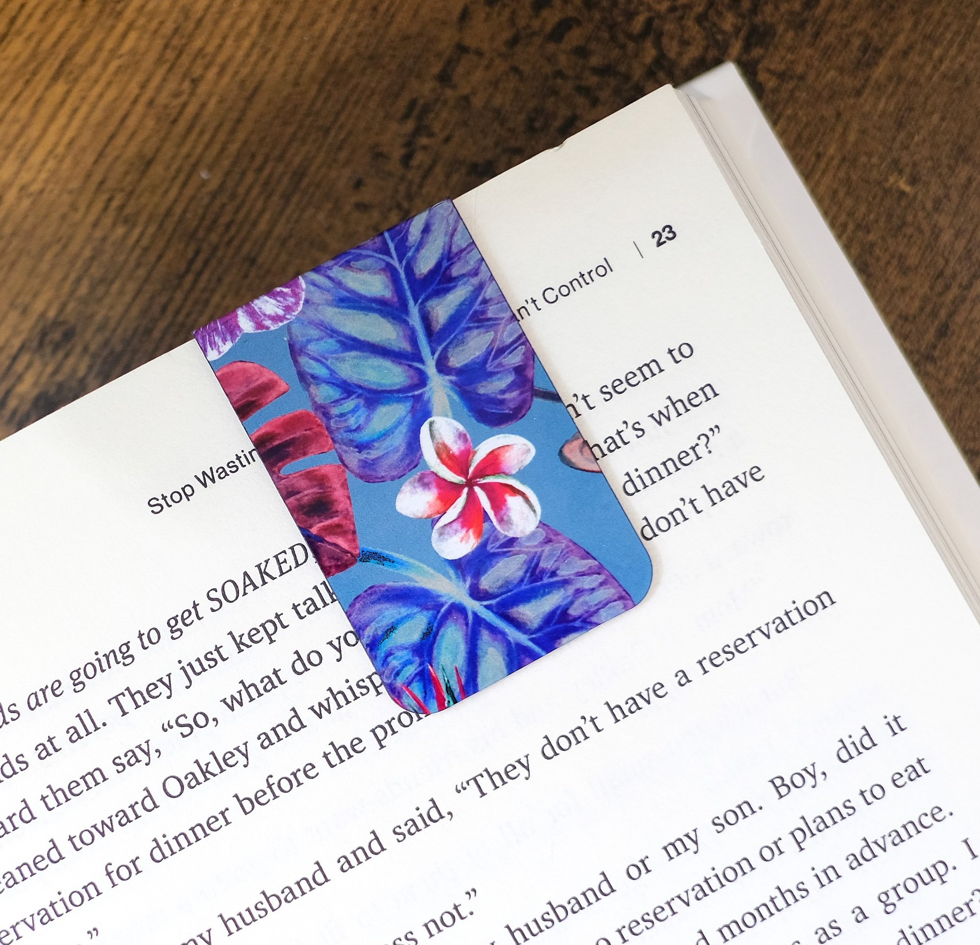 Beautiful and trendy handmade magnetic bookmark. Features colorful tropical leaves and flowers. The size of the bookmark is approx 1 1/2" x 4 1/2" open flat. It is approx 1 1/2" x 2" when folded over a page. The design is on one side. It is applied using the sublimation process which means it will not fade. The design is self-made and is a one of a kind. It would be great to use in your journal, planner and notebook.